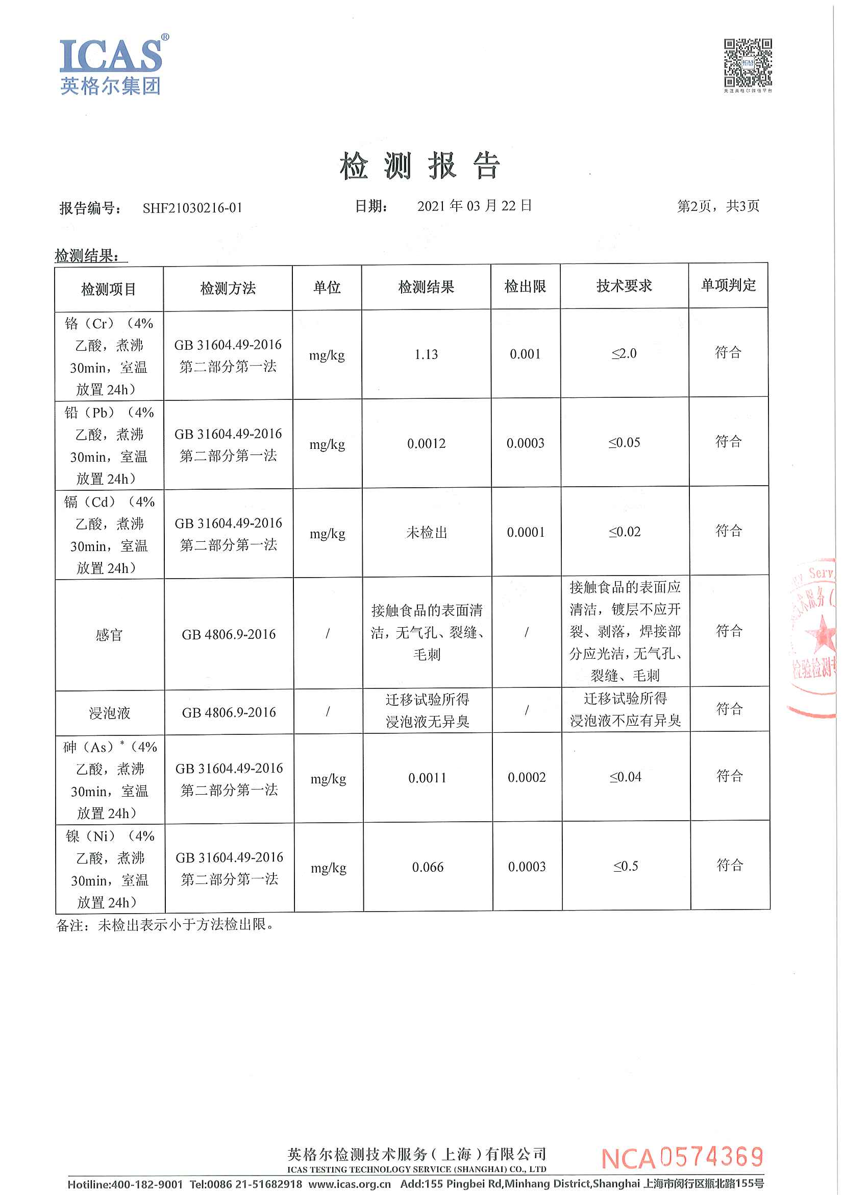 GB 4806.9-2016食品安全國家標準食品接觸用金屬材料及製品 檢測報告