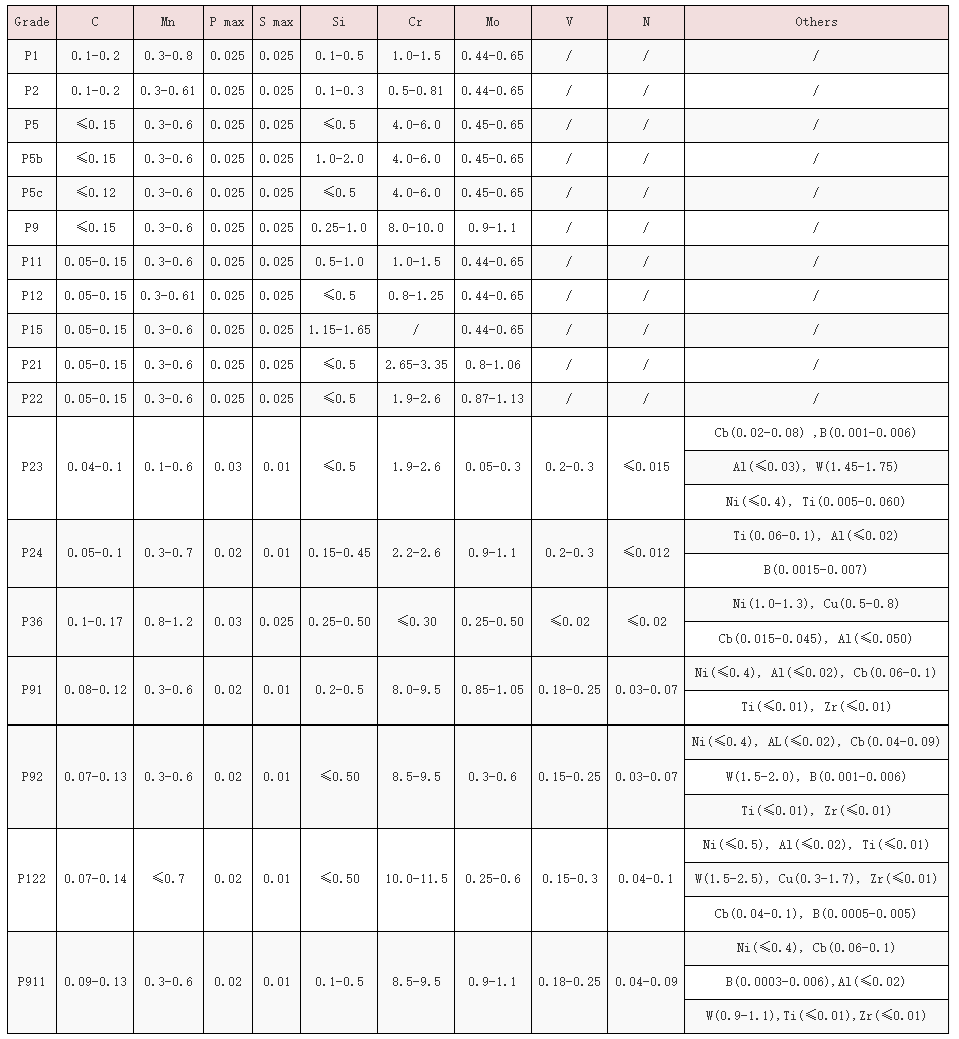 Chemical Composition(%) of ASTM A335 pipe ASTM A335管道的化學成分(%)