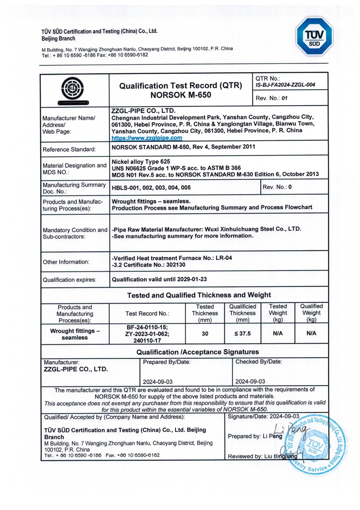 公司已通過挪威國家石油標準NORSOK M-650 ASTM B366 UNS N06625認證。