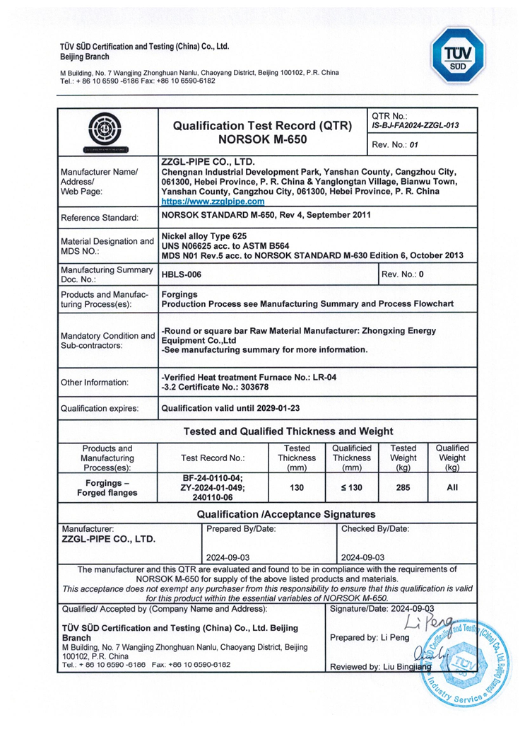公司已通過挪威國家石油標準NORSOK M-650 ASTM B564 UNS N06625認證。